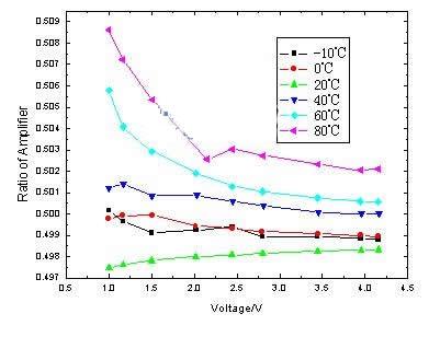 (2) 电压检测电路的误差。电压检测电路中的误差主要来自于电阻对的偏差以及三极管的偏差。对电压检测电路在不同温度下的放大倍数进行了实验,结果如图4所示。