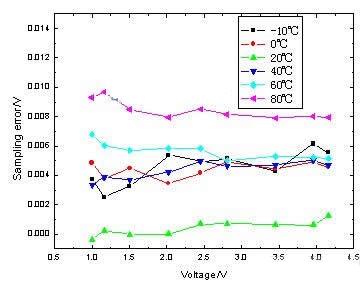 光电继电器部分的检测误差不仅随着温度变化,同时也随着被测量的电压值变化,从图3中可以看到,同一测量温度下,1V与4V的被测量电压之间的测量误差达到12mV。从图5中可以看到,而采样系统的误差仅仅同温度有关,而与被测量电压值无关。