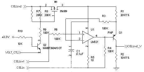 图中CELLn为第n节单体电池的电压,该电路可以对多串电池组的电压进行测量,并且不受串联节数的限制,而对串联电池组中的第一节单体电压不用采用该电路测量,可直接测量或者通过电阻分压得到。该电路的工作原理如下:在电路正常工作时,运放处于放大状态,运放的1、3脚为虚短虚断状态,即3脚的电压等于CELLn+1端的电压,而由于运放的输入阻抗非常大,因此电阻R3上的电流可忽略,在电阻R1上就是一节单体电池的电压,流过电阻R1的电流大小为: