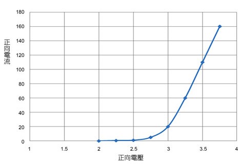 白炽灯泡的亮度能够藉减小电流的方法来调光至低于完整亮度的1%,因为白炽灯是藉由电流流过灯丝,使灯丝发热进而发光。但使用减小电流的方法,极难将LED亮度调至低于完整亮度的5%,因为所需的电压势会导致矽结点破裂并开始导电。LED是二极体,随着结点破裂,它就像是电子雪崩,电阻急速下降。要提供足够电压,使LED以极低电流导电非常困难。图2显示LED在不同正向电压(V)条件下的典型正向电流的曲线。