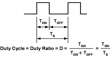 为LED提供脉波电流的方法也称作PWM,这种方法已经成为改变光等级的首选方法。LED本身是矽元件,对应流经它们的电流导通及关闭而快速地导通和关闭。开关时间在100奈秒(ns)等级,相当于最大频率10MHz。应用通常以100Hz~100kHz的频率工作。频率低于100Hz时,人眼会观察到LED光闪烁。频率在500Hz~20kHz之间时,电路可能产生能听到的杂讯。调光是通过在单个开关周期的某部分时间内将LED导通;而在此开关周期的其余部分时间内,将LED关闭来实现。这种导通关闭周期称作工作周期(D),其表达方式为LED导通时间(TON)除以整个开关/导通周期时间(TS)(图3)。