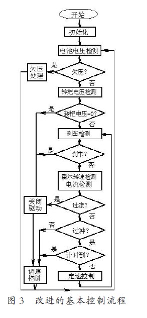 根据上述思路将软件控制流程进行修改。如图3 所示。将“速度增大而电流不增”作为“过冲”的判断依据??刂破鞒中觳馑俣缺浠偷缌鞅浠?,再经过判断,如果不属于“过冲”的情况,则执行子程序“调速控制”。这种情况下控制器检测转把电压值来调整PWM,增大或减小电流值使速度变化直至达到操作者通过转把设定的速度值。