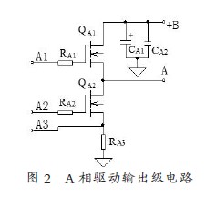 3)直流无刷电机的驱动控制:参见图1,此电路采用三相无刷直流电机。3 个霍尔位置传感器的空间间距为120o,输出信号a、b、c最终送给单片机作为转子位置检测信号及测速信号。其中A 相末级电路如图2 所示,在驱动电路中设置了电流检测。单片机根据霍尔转速信号和电流检测信号,经过分析判断,输出正确的PWM 控制信号给相应的线圈通电,从而控制电动机的起动、停止及转速等。