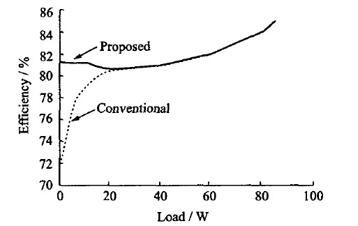 图14给出了集成了该低功耗电源系统的绿色多模式反激式控制器的效率图(工作频率为40~130kHz),并与传统的反激变换器效率进行了比较。由图可知,采用多模式反激式控制降低了芯片的轻载功耗,提高了效率。