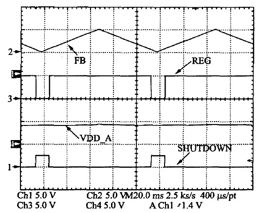 系统的多模式控制测试结果见图13。中载或重载下系统采用PWM 模式工作,许多单元的供电电源为REG=5 V.极轻载条件下则关断5 V的供电电源,减小系统的待机功耗,同时也有利于减小EMI和噪声。其过程如下:当FB电压低于一个阈值时,待机模式选择,则SHUTDOWN信号变高,关断5 V 电压源REG??椋盫DD-AD继续给芯片供电,保证在轻载时芯片的检测能够连续实现。
