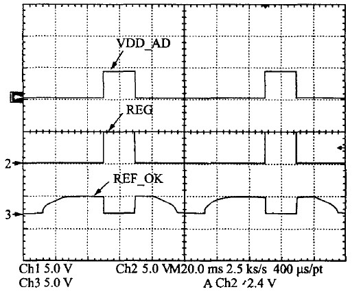 VDD-AD是检测模块的供电电压,设计驱动能力为2 mA.芯片负载减小时,关断REG,减小了芯片的静态功耗,这样既能保证芯片的驱动能力,又同时降低了芯片的静态功耗。
