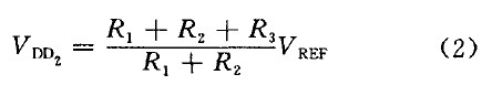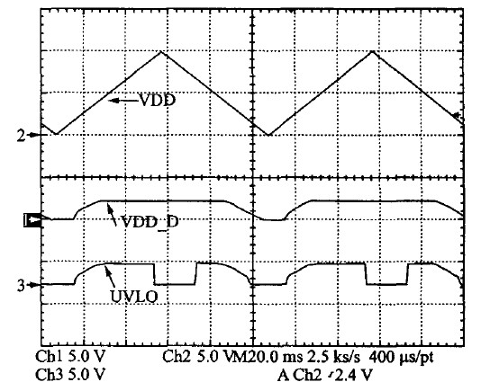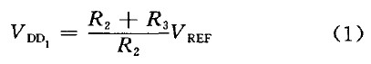 时,比较器跳转,N1开通,UVLO-out开始变l.通过合理设置R1、R2、R3值就可以使VDD1=9.5 V,VDD2=7V,即VDD上升到9.5 V时UVLO输出为零,芯片正常工作; VDD下降到7 V 时芯片停止工作。