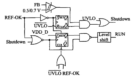 模式控制逻辑用以保证在进行模式选择时,电源系统正常工作。当FB电压底于0.5 V时,该控制逻辑通过内部电流滞回比较器自动选择进入待机模式。RUN信号(其为高电位有效)用来关断绿色多模式反激变换器中的其它控制???,以实现低待机功耗。