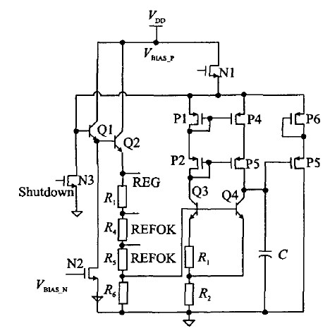 图5为5 V稳定电压源(REG)的电路原理。其中P1、P2、P3、P4组成共源共栅结构,可以提高电流镜的镜像精度,同时提高电源抑制比。Q3、Q4、R 1、R2组成一个带隙基准电压,这样可以减小额外的电流支路,降低功耗。Q1、Q2组成达林顿结构,增加输出能力。P5、P6增加匹配,减小沟道长度调制效应。Q1、Q2、R3、R4、R5、R6、Q4、P5、P6组成一个负反馈环路,将REG电压稳定在5 V。图中C具有两种作用:1、记忆直流工作点;2、补偿环路电容。