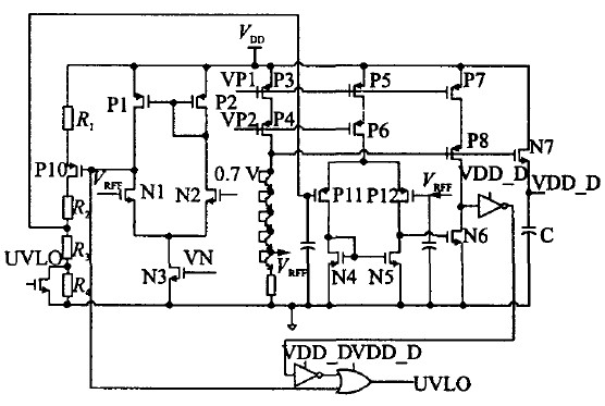 电路的工作原理可简述如下:12 V供电电压可在VDD比较低时建立一个PTAT (ProportiONal toabsolute temperature)电流源,然后利用其建立起带隙基准电压源;当VDD由0上升时,带隙基准电压r首先建立,此时两个比较器的输出为低电位,P1导通,输出为高电位;当K1VDD大于 r时,COMP1输出跳变,N1管导通,锁存器锁存上一个信号,UVLO为高电位(注意其为低电位有效);当K2VDD大于VREF 时,N2导通,则UVLO-out为低电位,使能其他模块;随着VDD减小,K2VDD首先小于VREF,N2关断,则锁存器锁存信号,UVLO-out保持;当 VDD减小到K1 VDD小于VREF时COMP1跳变,P1导通,N1关断,则输出UVLO-out为高电位,关断整个控制芯片。