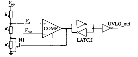 时,比较器开始跳变,N1关断,UVLO-out为0,使能整个控制芯片。当外部电源电压开始减小到:
