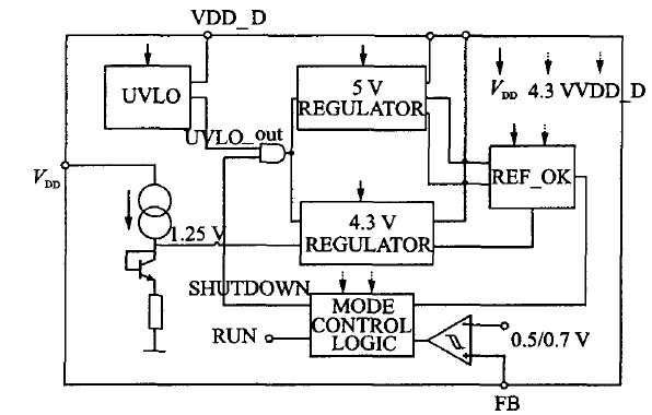 4.3 V 的稳定电压源(VDD-AD)用来在轻载时为系统供电,始终保持工作,在BURST模式下由它为模拟??楣┑?。