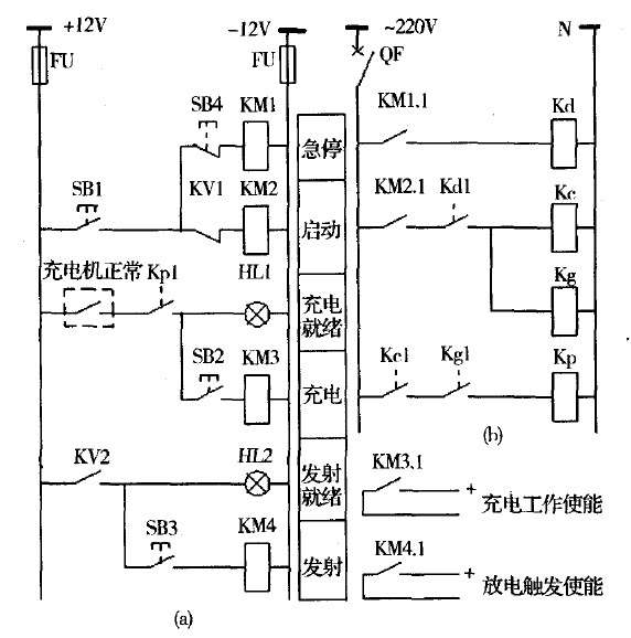 图3(a)中,KM1-4为SSR,SB1-4为自锁按钮。系统上电后,通过按钮SB1启动KM1和KM2,这样Kd将首先得电动作,随后Kc、Kg、Kp也相继动作,为下一步进行的充电工作做好了准备。图3(b)中,Kc和Kg启动采用了位置接点Kdl,同样Kp启动也采用了位置接点Kcl和Kgl,这样设计目的是使控制电路具有了逻辑动作与防误闭锁功能。此时只要充电设备自检正常(图3(a)中"充电机正常"接点闭合),则灯HI 1指示可以进行充电,通过按钮SB2启动KM3便可对脉冲电容器组进行充电。脉冲电容器电压达到预设值后,KV动作,常闭接点KV1断开致使KM2失电,则Kc、Kg、Kp相继返回,同时Kp返回又使KM3失电,这样Kc、Kg断开,充电机停止工作,满足了系统放电前提。此时灯HL1熄灭、KV2接通,灯HL2指示充电完毕,通过按钮SB3启动KM4则可进行ETCG发射。