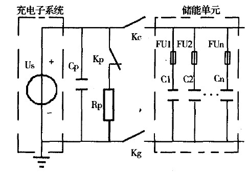 通常,充电子系统内部配有过电流、过电压和过热等故障?;せ蛞斐8婢爸?。但这些装置的?;し段б话憬鱿抻诔涞缱酉低衬诓?,PPS放电时浪涌电压等外部因素仍可能造成充电设备损坏。因此,在储能单元和充电子系统间还需配置一些隔离和?;さ缏?。图1给出了用于ETCG研究的PPS所配置的充电隔离及?;さ缏?。图1中,充电隔离开关(Kc)和地绝缘隔离开关(Kg)在充电结束后打开,用以防止PPS放电时由负载等因素产生的浪涌高电压通过充电子系统对地放电,可以避免因此所造成的充电设备绝缘损坏;充电输出终端并联了一小容量电容器(Cp)及其安全释能电路(开关Kp、电阻Rp),目的在于防止空载误充电,以避免在此情况下充电电路末端电压急剧升高损坏充电设备。