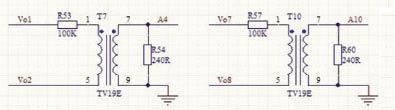 此系统输出是三相交流电,输出线电压为380V,故选择TV19E电压互感器,其输出负载电阻可以接0~500Ω,输出交流电压0~2.5V,此系统采用240欧的电阻,输出电压为-1.2V~1.2V。满足DSP的输入要求。电路如图3所示。