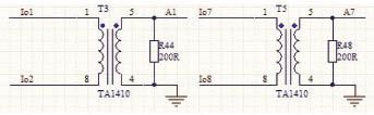 此系统输出电流小于1A,故选择最大可以测量1A的电压型电流互感器TA1410,负载电阻用是200欧,输出电压为-1V~1V的交流电压。电路如图4所示。
