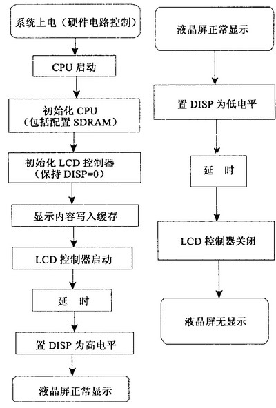 液晶显示器启动、关闭的测试流程图如图6。其中LCD控制器的初始化最为重要,须依照液晶显示??榈囊笈渲肅PU的寄存器和延时时间。