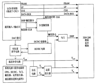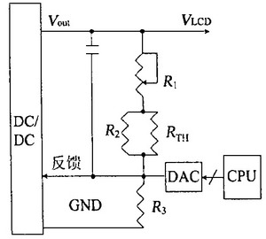液晶显示器对比度的调节可分为硬件调节和软件调节。图5的电路具有软、硬件调节功能。其中R1是可调电阻,可调节VLCD的电压,从而液晶显示器的对比度得到调节;电路中还可利用CPU与数模转换器(DAC)相结合来控制DC/DC的反馈端的电压,从而实现软件调节液晶显示器的对比度。