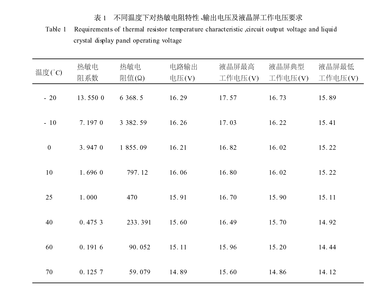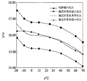 进行了模拟计算,结果如表1,由表1所得曲线如图4。表1和图4表明电路输出和液晶屏的要求吻合,电路能够保证液晶在-20~70°C 范围内正常显示。而且高、低温测试结果证实,在-20~70 °C范围内对比度正常。