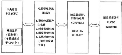 实现液晶显示须具备4个单元,其框图如图1所示。本文给出的电源管理电路设计方案具有驱动电压产生、时序控制、温度补偿和对比度调节的功能,其框图如图2所示。