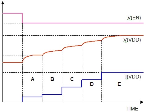 在A部分,通过限制流过分断开关的电流来减少负载电容充电时的浪涌电流;在B部分,升压转换器的开始电流限制在25%;在C部分,电流限制设在50%;在D部分电流限制为75%;在E部分,电流限制为100%。