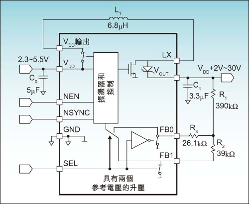 如上所述,当OLED工作在暗的模式时可以通过降低输出电压显著地节省功耗。因此为OLED电源选择的最佳电源芯片应包含能够提供这一功能的电路。采用两条独立的反馈路径就可实现这一功能,而且这两条反馈路径可以通过简单的逻辑输入进行选择。因此通过这种方法就可简单地实现PMOLED中使用的亮→暗→关节电技术。