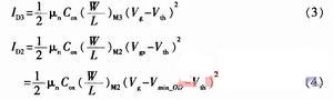 接下来将分析VM2、VM3和VM4组成的网络如何确保Vmin_OD大于0。分析电路可知,VM2、VM3工作在饱和区,VM4工作在线性区,因此ID3>ID4,ID4=ID2。