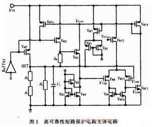 同时当短路发生时(即Vcon信号为低电平),VM7管正常工作,VM5管将导通,有一定的电流流向0UT端;因此一旦短路消除(即0UT端接有负载电阻),VM5管将对负载电容和负载电阻组成的并联RC网络充电,0UT端电压升高,Vcon信号将变为高电平,电路自动恢复正常状态。
