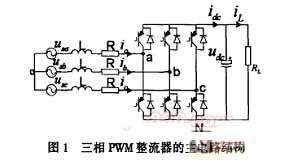 图1是三相PWM整流器的拓朴结构,功率开关按采用的调制方式动作,由于输入电感的滤波作用,整流器交流侧可近似认为是三相正弦电流;直流侧有大电容稳 压,输出呈直流电压源特性,稳态时输出直流母线电压可保持不变,一般情况下,要求控制输入电流与输入电压同相位,通常采用电压外环和电流内环的双环控制方 式,电压外环主要是保证直流输出电压稳定,电流内环主要是按电压外环输出的电流指令进行电流控制,如实现单位功率因素正弦波电流控制。