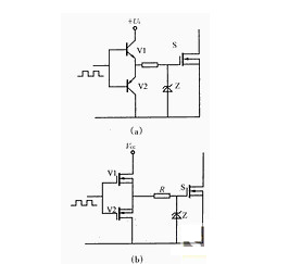 图1(a)为常用的小功率驱动电路,简单可靠成本低。适用于不要求隔离的小功率开关设备。图1(b)所示驱动电路开关速度很快,驱动能力强,为防止俩个MOSFET管直通,通常串接一个0.5~1Ω小电阻用于限流,该电路适用于不要求隔离的中功率开关设备。这两种电路结构特简单。