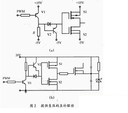 功率MOSFET属于电压型控制器件,只要栅极和源极之间施加的电压超过其阈值电压就会导通。由于MOSFET存在结电容,关断时其漏源两端电压的突然上升将会通过结电容在栅源两端产生干扰电压。常用的互补驱动电路的关断回路阻抗小,关断速度较快,但它不能提供负压,故其抗干扰性较差。为了提高电路的抗干扰性,可在此种驱动电路的基础上增加一级由V1、V2、R组成的电路,产生一个负压,电路原理图如图2(a)所示。