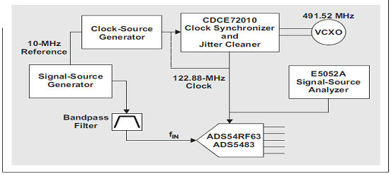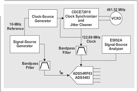 我们做了一个试验,目的是检查测得时钟相位噪声与提取自 ADC 测得 SNR 的时钟抖动的匹配程度。如图 11 所示,一个使用 Toyocom 491.52-MHz VCXO 的 TI CDCE72010 用于产生 122.88-MHz 采样时钟,同时我们利用 Agilent 的 E5052A 来对滤波相位噪声输出进行测量。利用一个 SNR 主要受限于采样时钟抖动的输入频率对两种不同的 TI 数据转换器(ADS54RF63 和 ADS5483)进行评估??焖俑道镆侗浠?(FFT) 的大小为 131000 点。