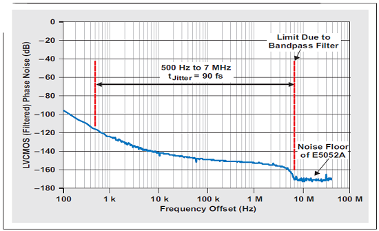 图 12 所示曲线图描述了滤波后 CDCE72010 LVCMOS 输出的测得输出相位噪声。131000 点的 FFT 大小将低积分带宽设定为 ~500 Hz?;稚舷抻纱?a target="_blank" style="text-decoration:none;" >滤波器设定,其影响在相位噪声曲线图中清晰可见。超出曲线图所示带通滤波器限制的相位噪声为 E5052A 的噪声底限,不应包括在抖动计算中。滤波后相位噪声输出的积分带来 ~90 fs 的时钟抖动。