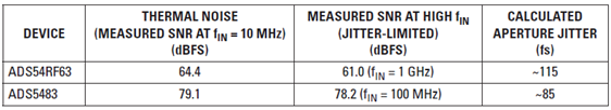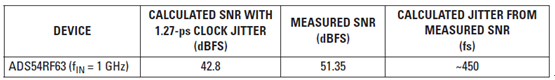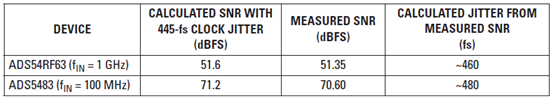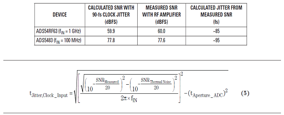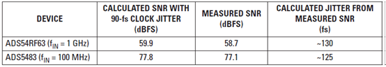 通过在时钟输入通路中安装低噪声 RF 放大器,两个数据转换器重复进行了高输入频率的 SNR 测量,其结果如表 5 所示。我们可以看到,测得 SNR 和预计 SNR 匹配的非常好。使用下面的方程式 5,计算得到的时钟抖动值在 90-fs 时钟抖动的 5 fs 以内,其结果通过相位噪声测得推导得出。