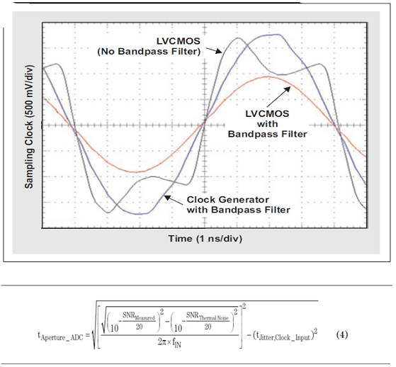 不匹配的原因是,计算得出的孔径抖动是基于时钟源生成器的快速转换速率。CDCE72010 的 LVCMOS 输出消除了时钟信号的高阶谐波,其有助于形成快速升降沿。图 13 所示波形图表明了带通滤波器急剧降低未滤波 LVCMOS 输出转换速率,以及将方波转换为正弦波的过程。