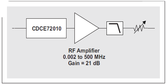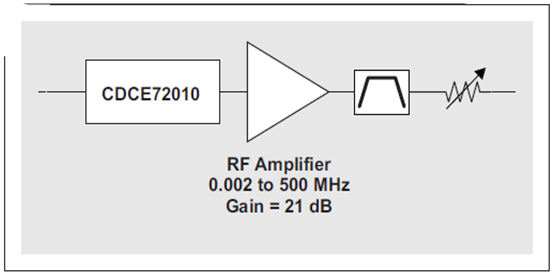 改善转换速率的一种方法是:在 CDCE72010 的 LVCMOS 输出和带通滤波器之间添加一个具有相当量增益的低噪声 RF 放大器,参见图 14。该放大器应该放置于滤波器前面,这样便可以将其对时钟信号的噪声影响程度限定在滤波器带宽,而非 ADC 的时钟输入带宽。由于下一个试验的放大器具有 21 dB 的增益,因此我们在带通滤波器后面增加了一个可变衰减器,旨在匹配滤波后 LVCMOS 信号到时钟生成器滤波后输出的转换速率。该衰减器可防止 ADC 的时钟输入超出最大额定值。