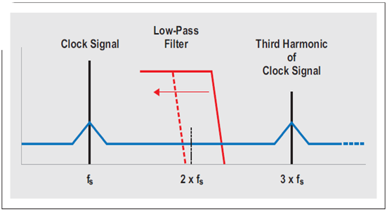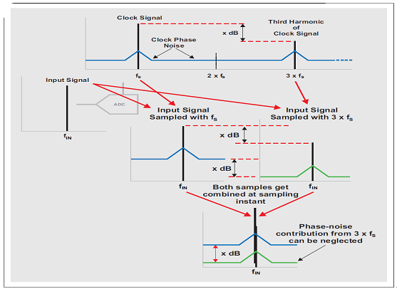 在采样时间,基频正弦波及高阶谐波与输入信号混频,如图 16 所示。(为了简单起见,仅显示了一个谐波。)因此,三阶谐波周围的相位噪声与输入信号混频,而第三谐波也形成一个混频结果。但是,由于时钟信号的第三谐波的振幅更低,因此该混频结果的振幅也被降低。