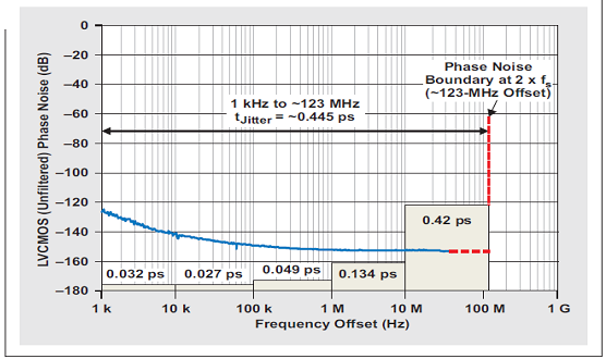 将不同转角频率的低通滤波器用于 ADS54RF63 的采样时钟(如图 18 所示),得到了一些如表 7 所列有趣值。该试验结果表明,LVCMOS 输出对时钟抖动的相位噪声影响被限制在约 200 到 250 MHz,其相当于 122.88-MHz 时钟信号的 80-MHz 到 130-MHz 偏移频率,并约为 2x 采样频率。因此,将宽带相位噪声扩至 123-MHz 偏移频率,会产生 ~445 fs 的时钟抖动,如图 19 所示。理想情况下,积分下限应该位于 500 Hz 处(原因是选择的 131000点FFT);但是,500-Hz 到 1 kMz 偏移频率的抖动贡献值极其低,因此为了简单起见其在本测量中被忽略。