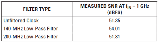 为了证明未滤波时钟信号的相位噪声需要积分至约两倍采样频率,我们实施了如下试验:在 CDCE72010 输出和 ADS54RF63 时钟输入之间添加不同的低通滤波器。