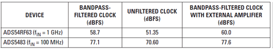 如后面图 19 所示,CDCE72010 的未滤波 LVCMOS 输出相位噪声在 –153 dBc/Hz 附近稳定,其始于 ~10 MHz 偏移频率,原因可能是 LVCMOS 输出缓冲器的热噪声。ADS54RF63 EVM 具有 ~1 GHz(受限于变压器)的时钟输入带宽;因此理论上而言,应该可以对相位噪声求积分为 ~1GHz(在900-MHz 偏移频率的 3dB 时下降)。这会带来 ~1.27 ps 的采样时钟抖动,并将 fIN = 1GHz 的 SNR 降至 ~42.8 dBFS!