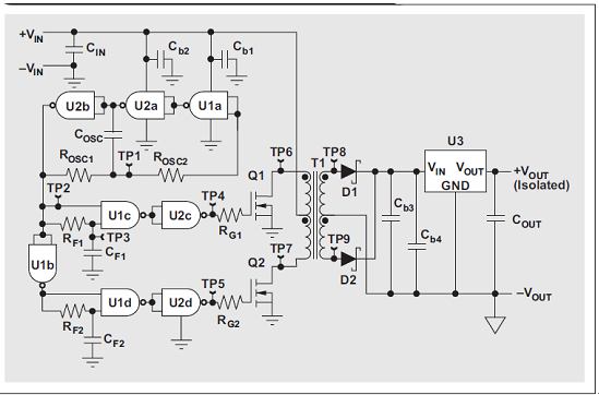 如果应用要求 2 kV 以上的隔离电压、60% 以上的转换器效率或者标准组件可靠的有效性,那么分立设计就是一种能够替代集成组件的低成本方案。分立 DC/DC 转换器设计的缺点是需要做大量的工作——选择稳定的振荡器结构和先断后通电路,选择可以通过标准逻辑门有效驱动的MOSFET,适宜实施温度和长期可靠性测试。所有这些努力都要花费时间和资金。因此,在仓促进行这样一个计划以前,设计人员应该考虑到下列事项:集成组件通常已通过温度测试,并且拥有其他工业资质。这些组件不仅仅是最可靠的解决方案,而且还拥有较快的上市时间。