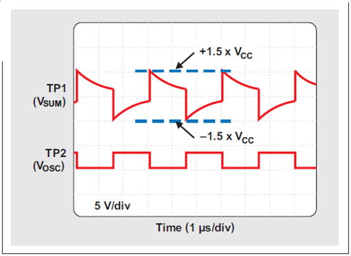 著名的三反相门振荡器由 U1a、U2a 和 U2b 组成,选择它是因为它在供电波动方面较为稳定。通过一个 100-pF 陶瓷电容器(COSC)和两个 10-kΩ 电阻器(ROSC1 和 ROSC2),它的正常频率被设定为 330kHz。在 3.0-V 到 3.6-V 电源电压波动范围内,振荡器拥有接近 50% 的占空比,以及低于 ±1.5% 的最大频率波动。图 2 显示了 ROSC1 和 ROSC2 (TP1) 相加点和振荡器输出 (TP2) 处的波形。所有电压均为参考电路基准电压测得。[page]