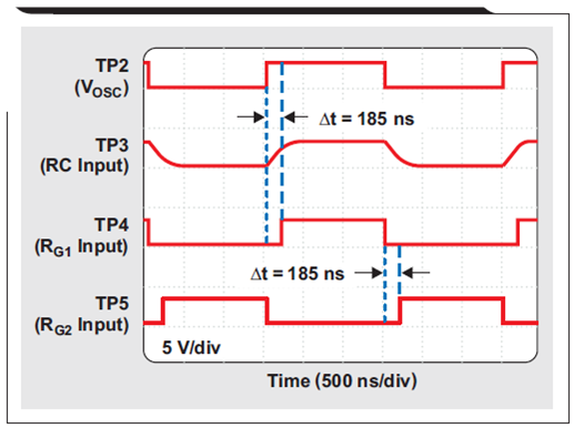 施密特触发电路 NAND 栅极(U1c、U1d)实现先断后通功能,以避免 MOSFET 导通阶段交叠。其他两个NAND门(U2c,U2d)配置为反相缓冲器,从而产生驱动 N 通道 MOSFET(Q1、Q2)必需的正确信号极性。图 3 显示了完整的先断后通动作。为了适应标准逻辑门的有限驱动能力,我们选择了 MOSFET,因为其较低的总电荷和较短的响应时间。