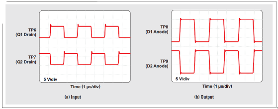 隔离变压器 (T1) 拥有 2:1 的次级对初级匝数比、0.9 mH 的初级线圈电感,以及 3kV 的保证隔离电压。图 4 显示了变压器的输入和输出波形。