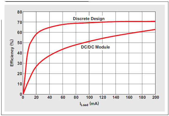 图 5 显示了 4.93 V 输出电压条件下图 1 所示电路的纹波,而图 6 将该电路的效率同具有稳定输出的集成 DC/DC 组件进行了对比。