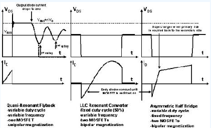 图1所示为采用三种不同拓扑(准谐振反激式拓扑、LLC谐振拓扑和使用软开关技术的非对称半桥拓扑)的开关的电压和电流波形。