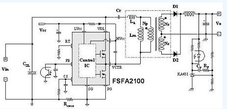 上述两种拓扑都可以采用同步整流。对非对称半桥拓扑,这实现起来非常简单(参见飞兆半导体应用说明AN-4153)。对LLC控制器,需要一个特殊的模拟电路来检测流入MOSFET的电流,如果开关频率被限制为第二个谐振频率(图2中的100kHz),该技术是比较简单的。