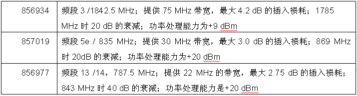 - 857019可提供30 MHz的带宽和在869 MHz时20 dB的衰减