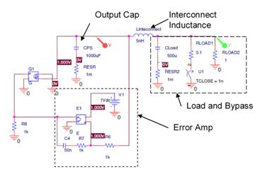 为了讨论方便,图1显示了电源系统的P-SPICE模型。本图由补偿电路电源、调制器(G1)和输出电容器组成。内部还包括互连电感、旁路电容负载模型、DC负载和步进负载。