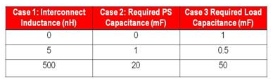 表1对举例系统三个互连电感的要求电容器进行了比较。通过改变互连电感、计算负载旁路电容并设计电源的相应输出级和控制环路,得到比较数据。案例1的负载和电源并列放置;案例2电源和负载之间的互连电感大小为中等。案例3中,使用线缆连接的电源的电感极高。要求旁路的多少直接与互连电感有关。